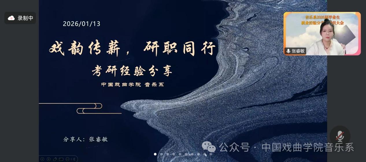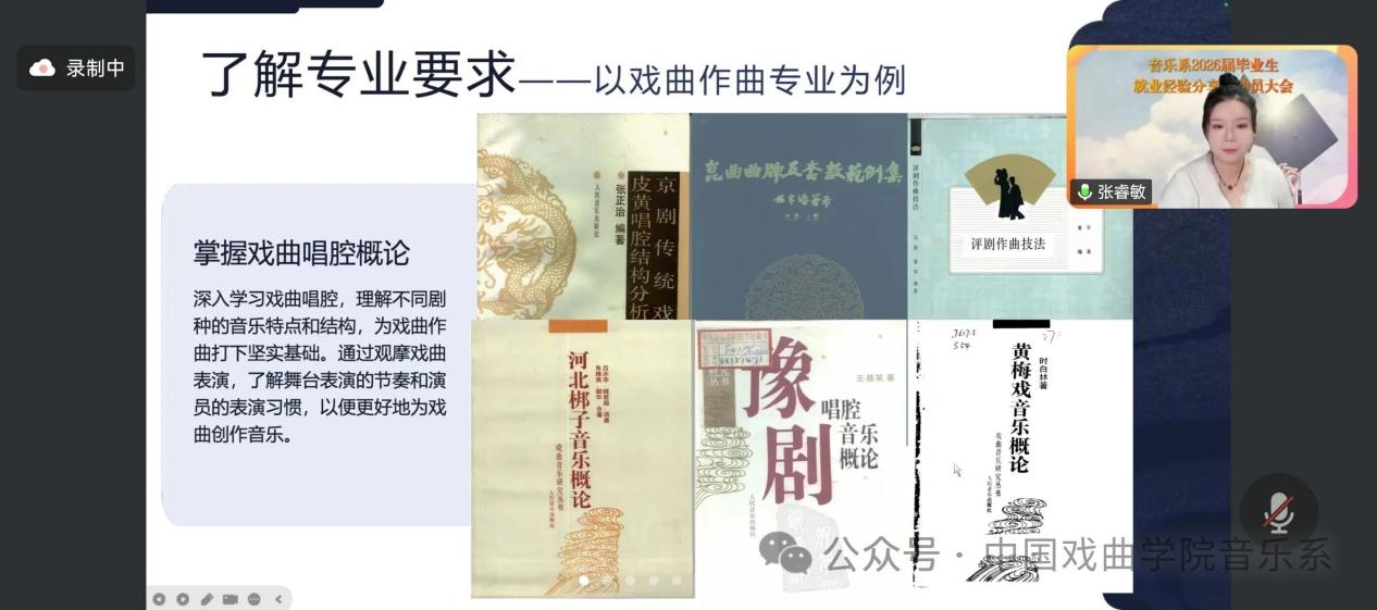 张睿敏从考研前期准备、初始考试科目介绍、初试复试考试流程、备考策略分享、成功经验交流五个部分,进行了全流程细致分享,针对戏曲作曲专业的核心考点与备考技巧提供了具体指引,强调深耕专业与科学规划的重要性。