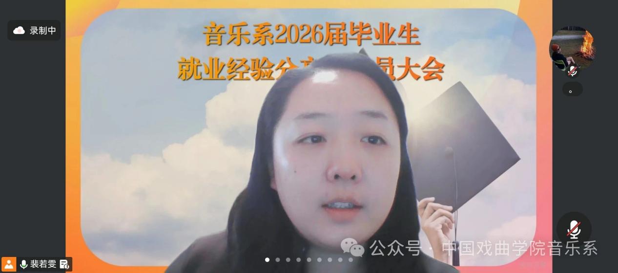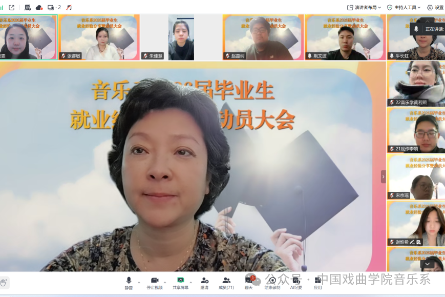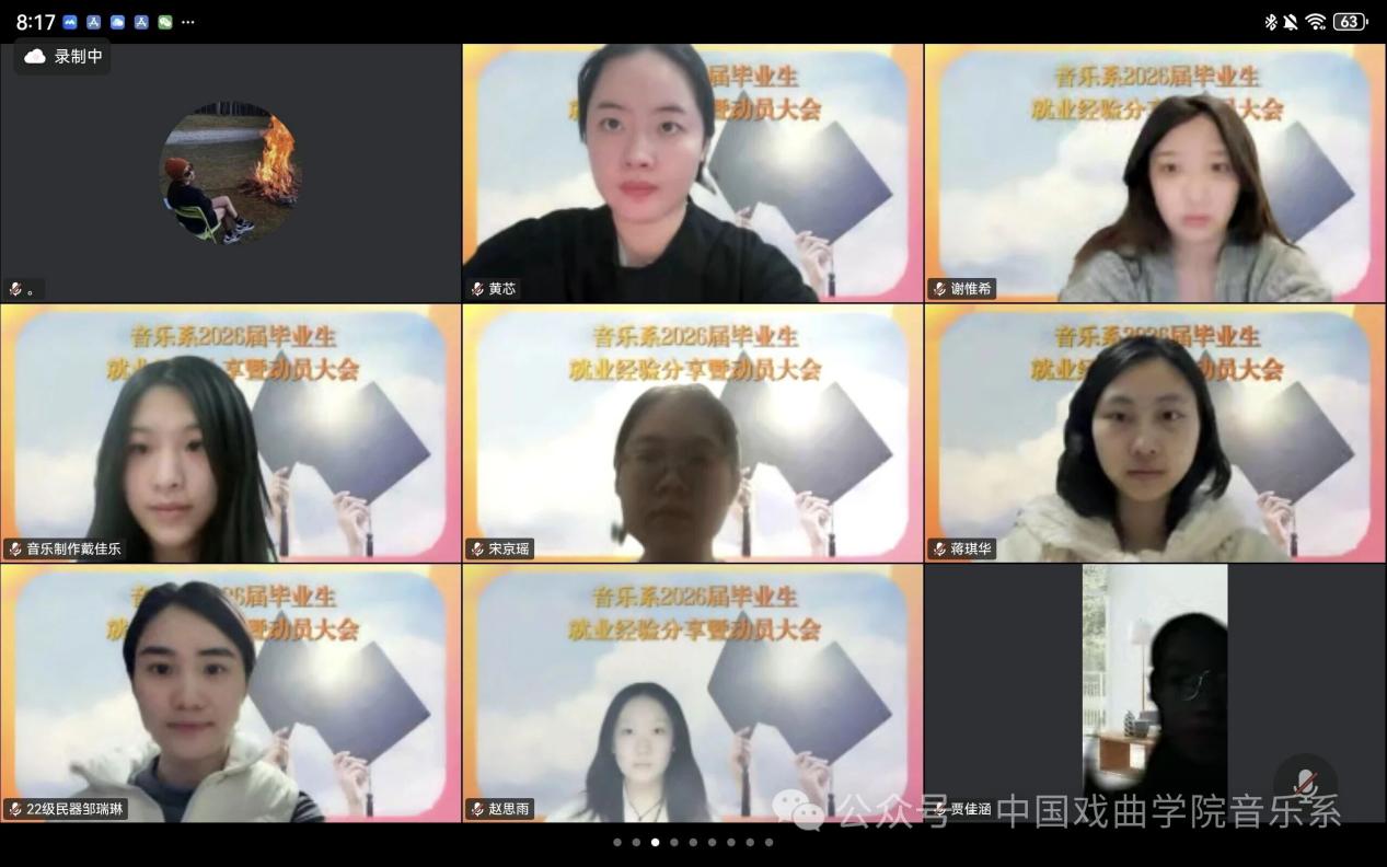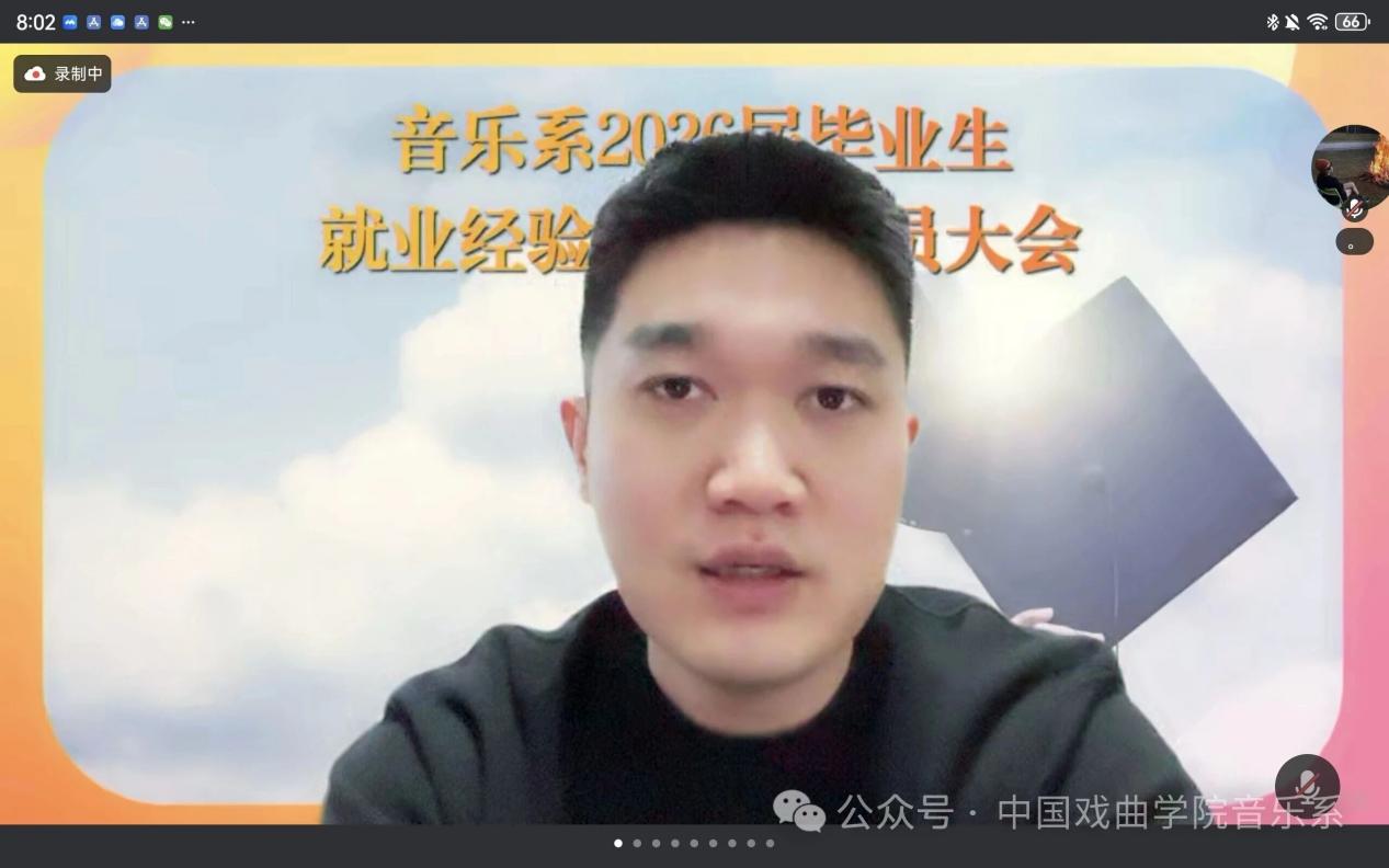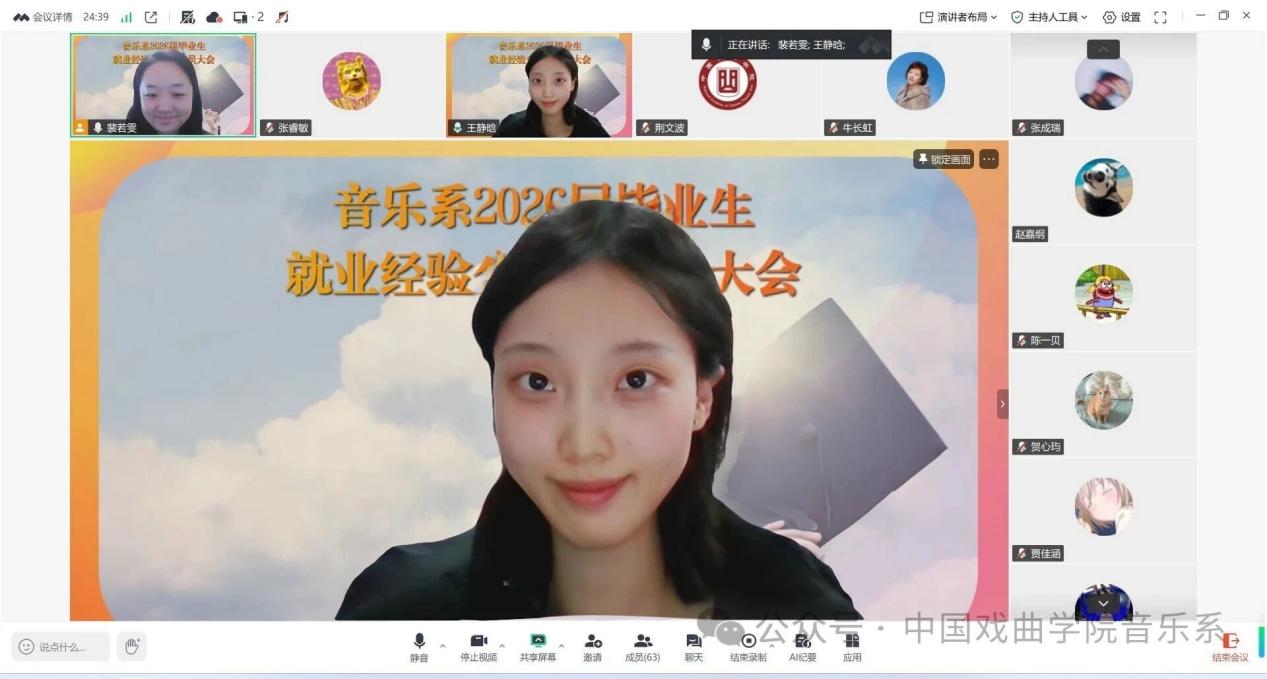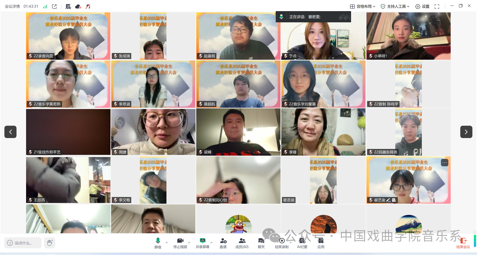 为进一步推动2026届毕业生实现高质量充分就业,引导学生尽早树立职业规划意识,助力2026届毕业生精准应对考研复试与春招挑战,1月13日,音乐系党总支精心筹备,以线上形式成功举办了“戏韵传薪,研职同行——音乐系优秀学子就业考研经验交流会”。音乐系党总支书记牛长虹、党总支全体成员、辅导员、毕业班班主任与全体2026届毕业生相聚云端,共同探讨升学与就业之路。会议由牛长虹主持。
