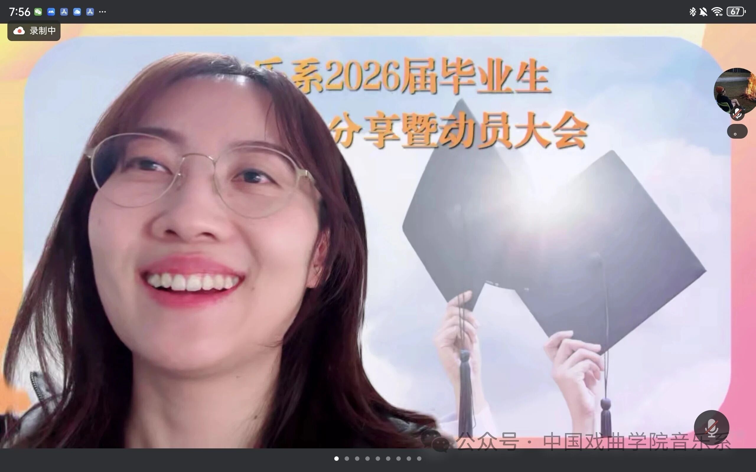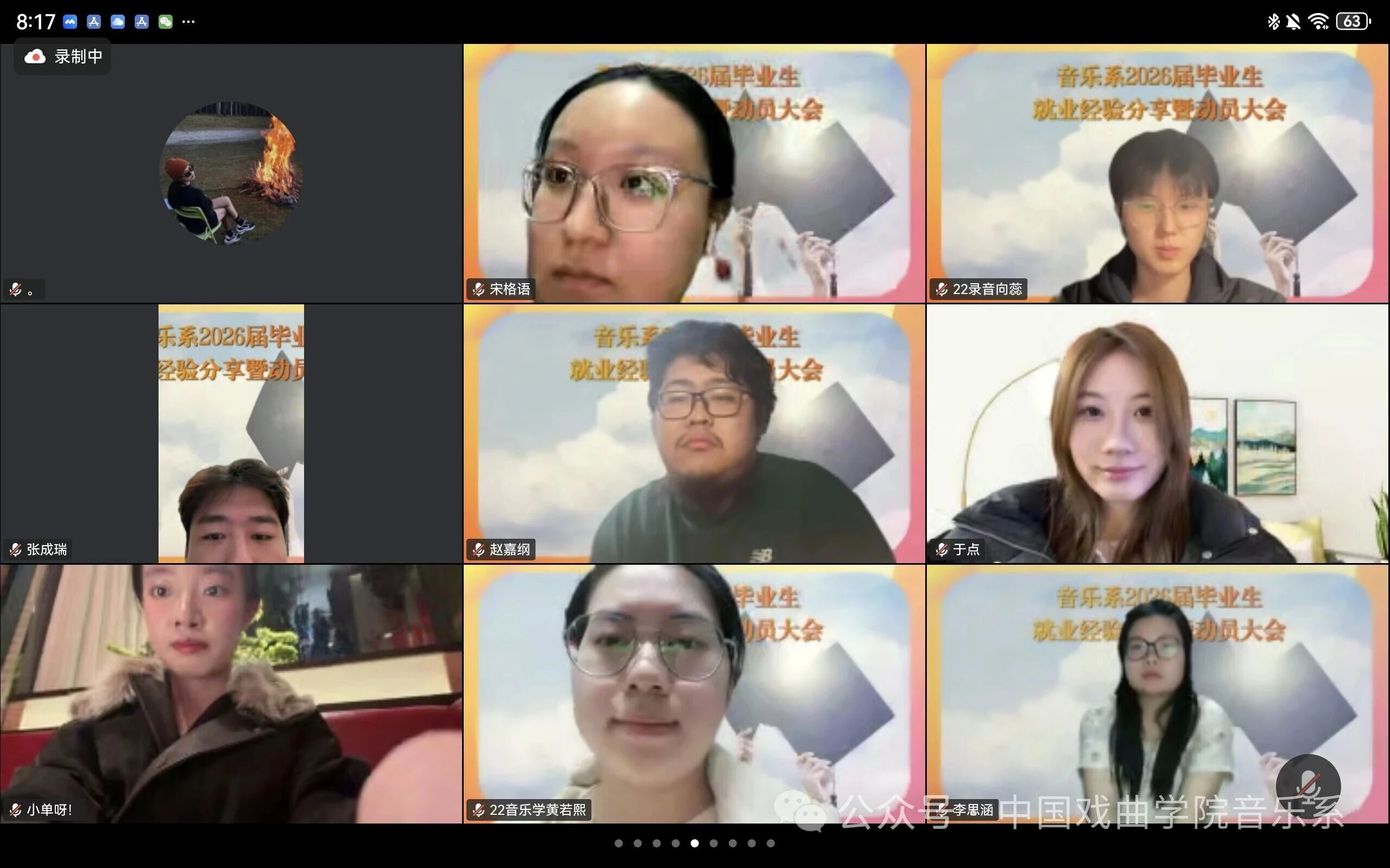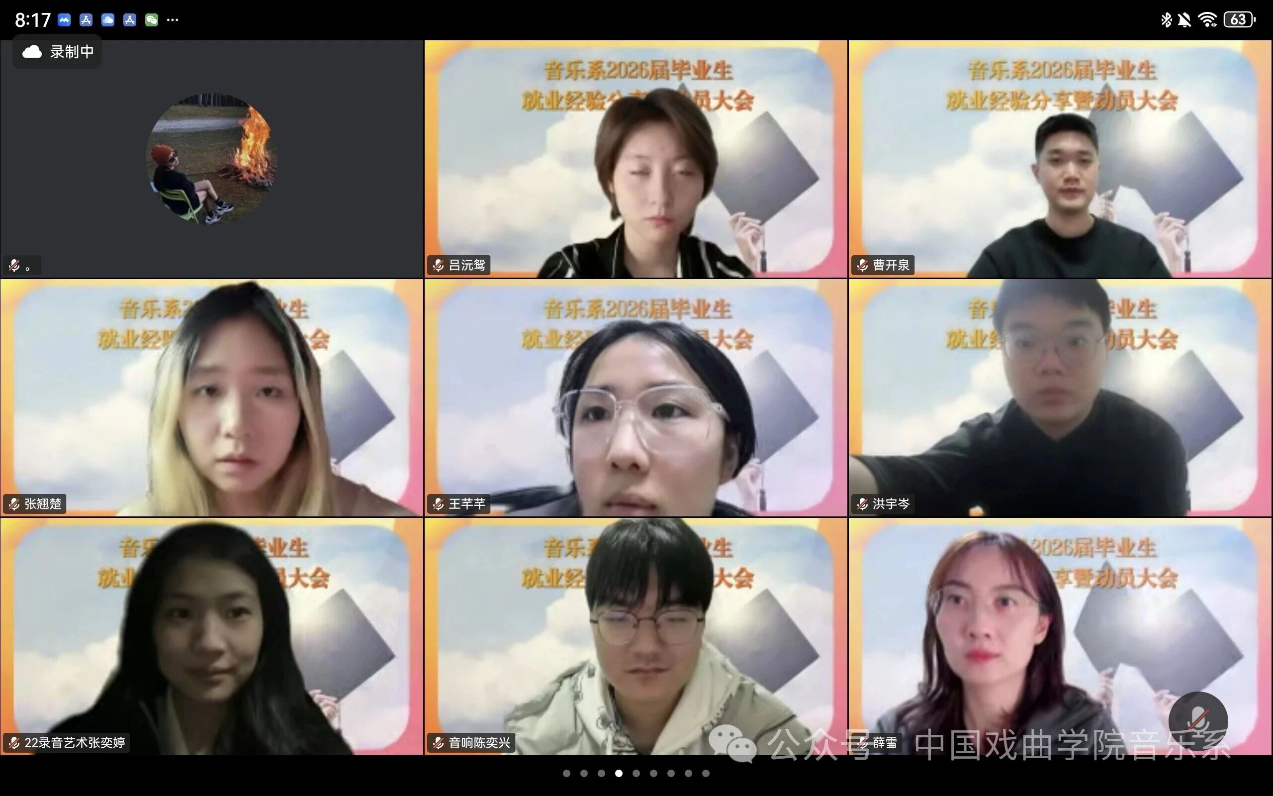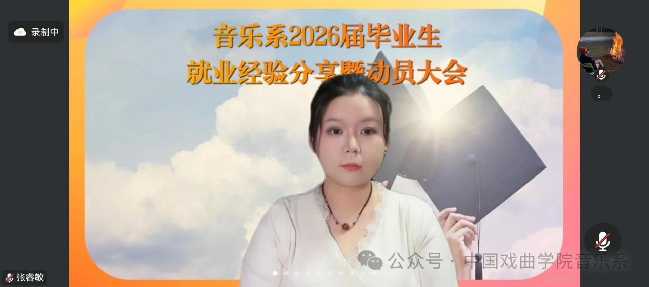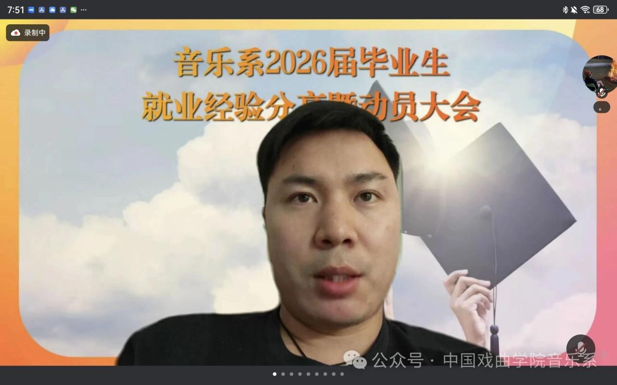 为进一步推动2026届毕业生实现高质量充分就业,引导学生尽早树立职业规划意识,助力2026届毕业生精准应对考研复试与春招挑战,1月13日,音乐系党总支精心筹备,以线上形式成功举办了“戏韵传薪,研职同行——音乐系优秀学子就业考研经验交流会”。音乐系党总支书记牛长虹、党总支全体成员、辅导员、毕业班班主任与全体2026届毕业生相聚云端,共同探讨升学与就业之路。会议由牛长虹主持。