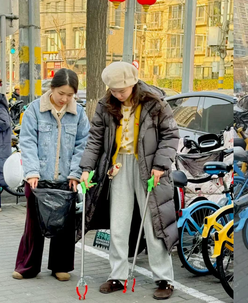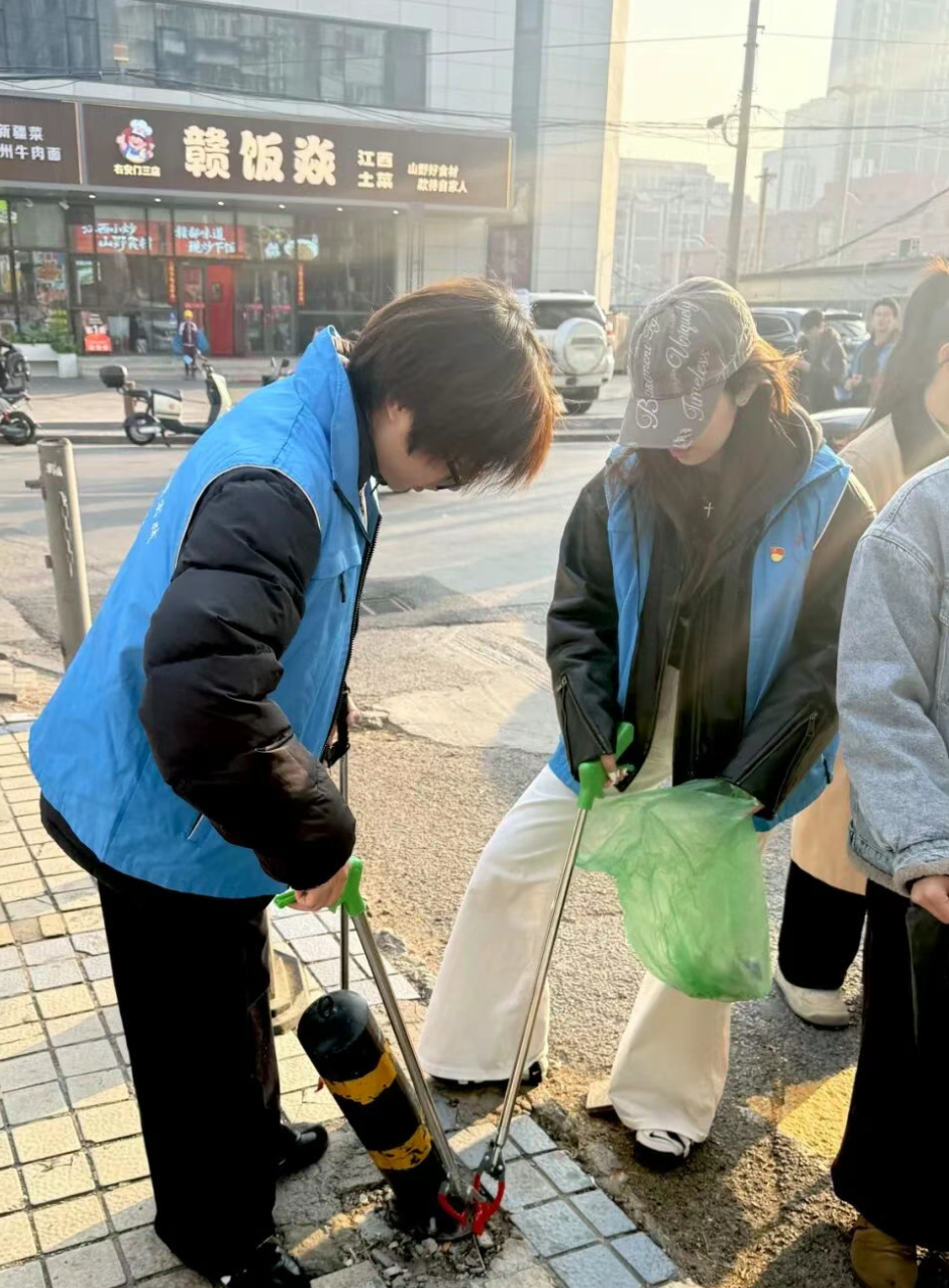 活动伊始,志愿者们身着统一蓝色志愿马甲,在明确任务后即刻投入行动。大家分工协作、默契配合,重点对右安门周边街道、人行道及非机动车停放区进行全面清理:俯身捡拾路面烟头、纸屑、塑料袋等杂物,细致整理违规停放的共享单车与电动车,同时清理卫生死角、擦拭公共设施,不放过任何一处细节。初春的阳光洒落街巷,志愿者们忙碌的身影穿梭其间,用双手为社区环境“焕新颜”,蓝色马甲俨然成为街上一道亮丽的“风景线”。