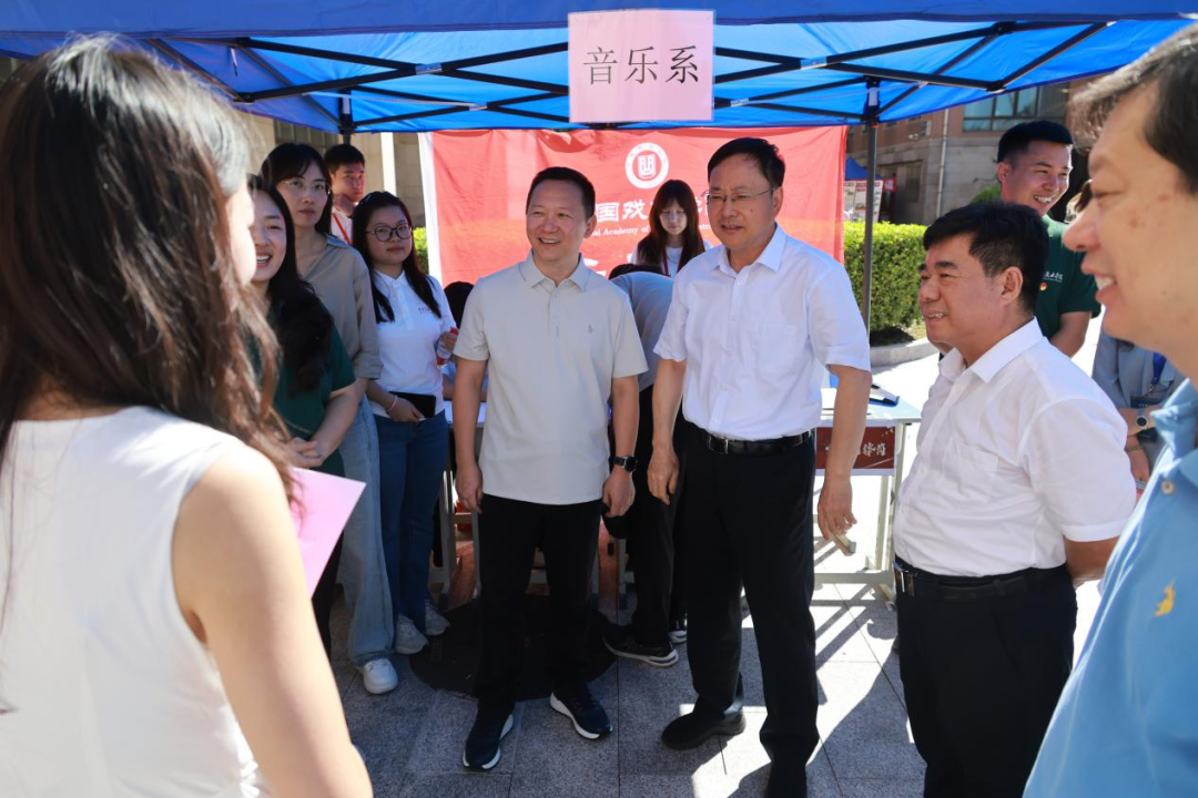 学校领导莅临现场,与报到现场的25级新生亲切交谈,了解新生报到进展、学生住宿生活等情况,对音乐系细致周到的迎新安排给予肯定。