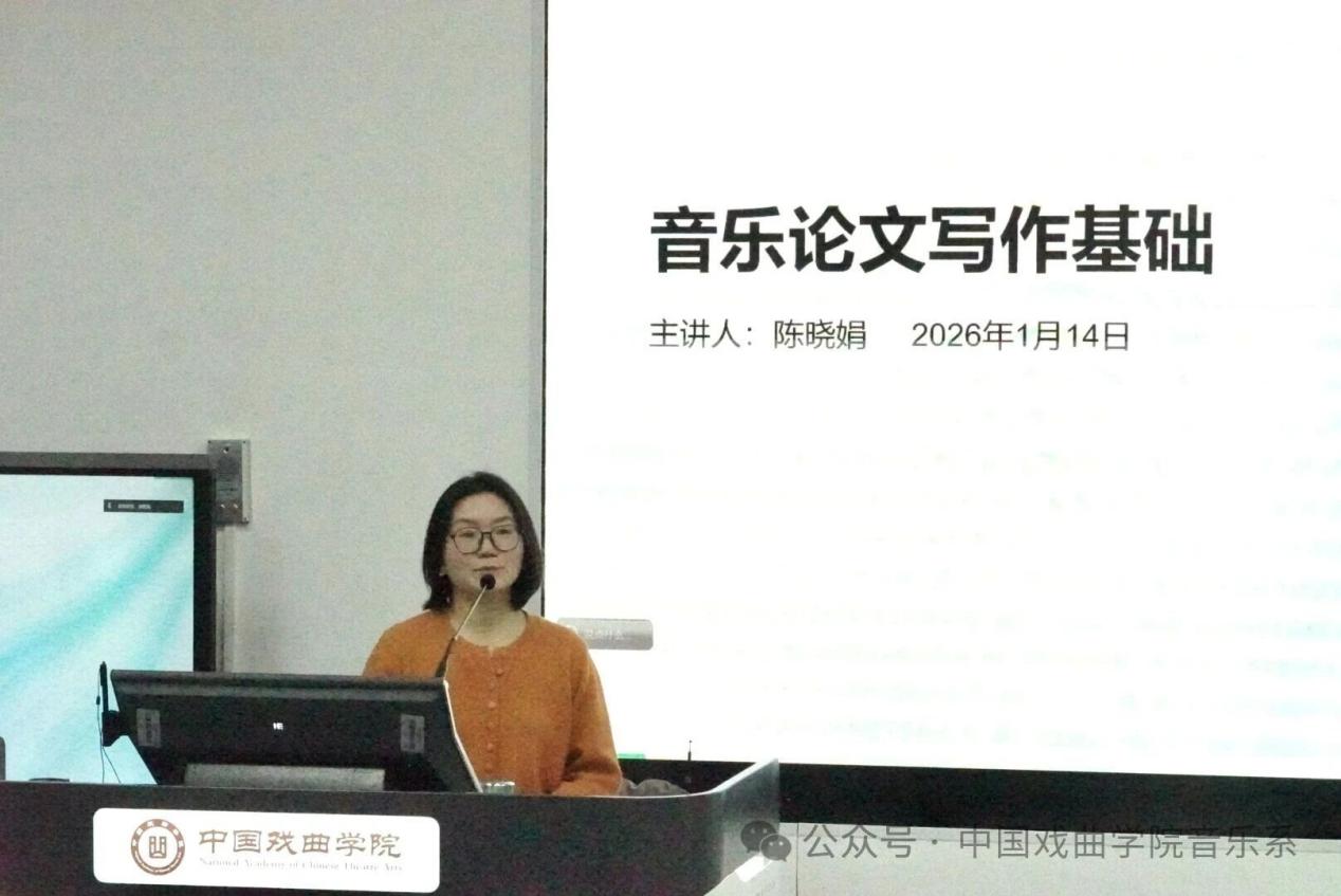 2026年1月14日,音乐系举办系列学术讲座,邀请音乐系音乐学、研究生教研室主任陈晓娟副教授,以“音乐论文写作基础”为题开展讲座。讲座由音乐系主任王啸冰主持。