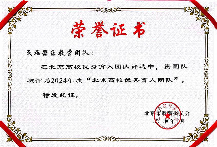 音乐系始终将“培养什么人、怎样培养人、为谁培养人”这一根本问题摆在首要位置,教师指导学生在各类专业竞赛中取得优异成绩。师生在文化和旅游部主办的第七届、第八届全国青少年民族器乐教育教学成果展示活动中表现突出,共入围成果26项,其中第七届入围9项,第八届入围17项,7个项目荣获“优秀表演人才”“优秀精品课”等荣誉;成立第八届全国青少年民族器乐教育教学成果展示活动师生临时党支部,实现思想引领与专业实践同频共振;学生在“敦煌杯”“国韵杯”等全国重大赛事中屡创佳绩,百余人次斩获金奖、一等奖等奖项。学生担任唱腔写作的新编京剧现代戏《迟开的山丹丹》入选北京高校校园原创文化精品。师生所创作的京歌《青春之约》荣获北京市教委2022年北京大学生音乐节“最受师生喜爱奖”。2022级民族器乐班荣获“北京市先进班集体”,多人获北京市优秀毕业生荣誉称号,连续5年共计9名学生获得国家奖学金。